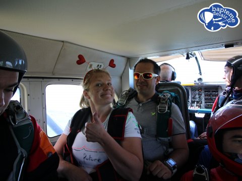 Lorsque votre tour est annoncé, on vous équipe avec la tenue et le harnais fournit sur place et vous prenez place dans l’avion avec les autres participants et parachutistes. La montée dure de 15 min à 30 min suivant l’avion. De quoi regarder le paysage.