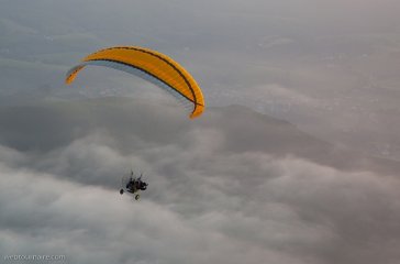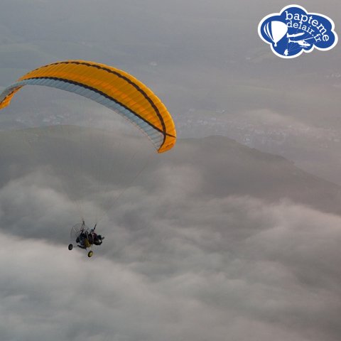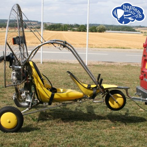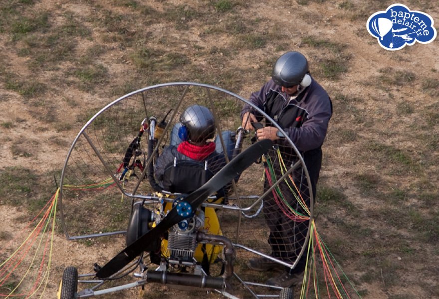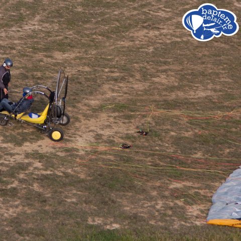 Le paramoteur utilisé est de la marque française Adventure, un réseau mondial de référence. Il dispose d'une voile à caisson d'une quarantaine de mètres carrés et d'un chariot biplace où vous serez assis confortablement devant le pilote. La voile dispose de multiples suspentes en fibres de kevlar (presque 500m de suspentes !) qui peuvent supporter chacune entre 200kg et 300 kg suivant leur section. Autant dire que c'est du solide. Un matériel de qualité à la fiabilité reconnue que nous aimons bien chez baptemedelair.fr.