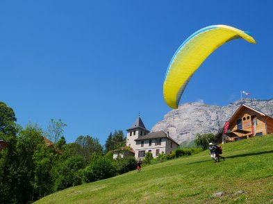 Pilotage parapente entre Grenoble et Chambery dans l'Isère (38) Excellent compromis pour découvrir la pratique du parapente cette journée découverte combine l'apprentissage du décollage sur pente école herbeuse et le plaisir du vol biplace en parapente.