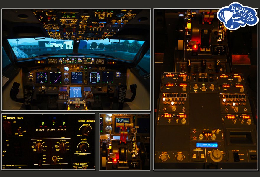 Equipement: Le simulateur proposé est une réplique à l'échelle 1 de la cabine de pilotage du célèbre Boeing 737-800 NG. La forme du cockpit est très réaliste ainsi que les commandes, sélecteurs et autres instruments de navigation. Les ordinateurs de bord sont fonctionnels. Des écrans sont répartis à 180° pour une vision panoramique totalement immersive. Enfin, pour ajouter un ultime degré de réalisme, le simulateur est placé sur des bielles permettant le mouvement (en option) et la reproduction de toute une gamme d'informations sensorielles comme les accélérations, vibrations, turbulences etc... Ce système est à ce jour unique en France. Bien qu'il ne soit pas homologué en France pour comptabiliser officiellement des heures de vol (il l'est dans d'autres pays) ce simu sera une bénédiction pour les pilotes désirant développer ou maintenir des compétences et pour le grand public avide d'expériences hors du commun.