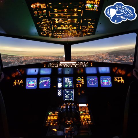 Vous prendrez place à bord d'un simulateur de type Airbus A320. Ce simulateur immersif grand public à l'échelle 1 est une réplique très réaliste du cockpit de l'Airbus A320. Grâce à sa base fixe et son visuel panoramique, il est idéal pour une immersion à moindre coût dans le monde des pilotes de ligne.